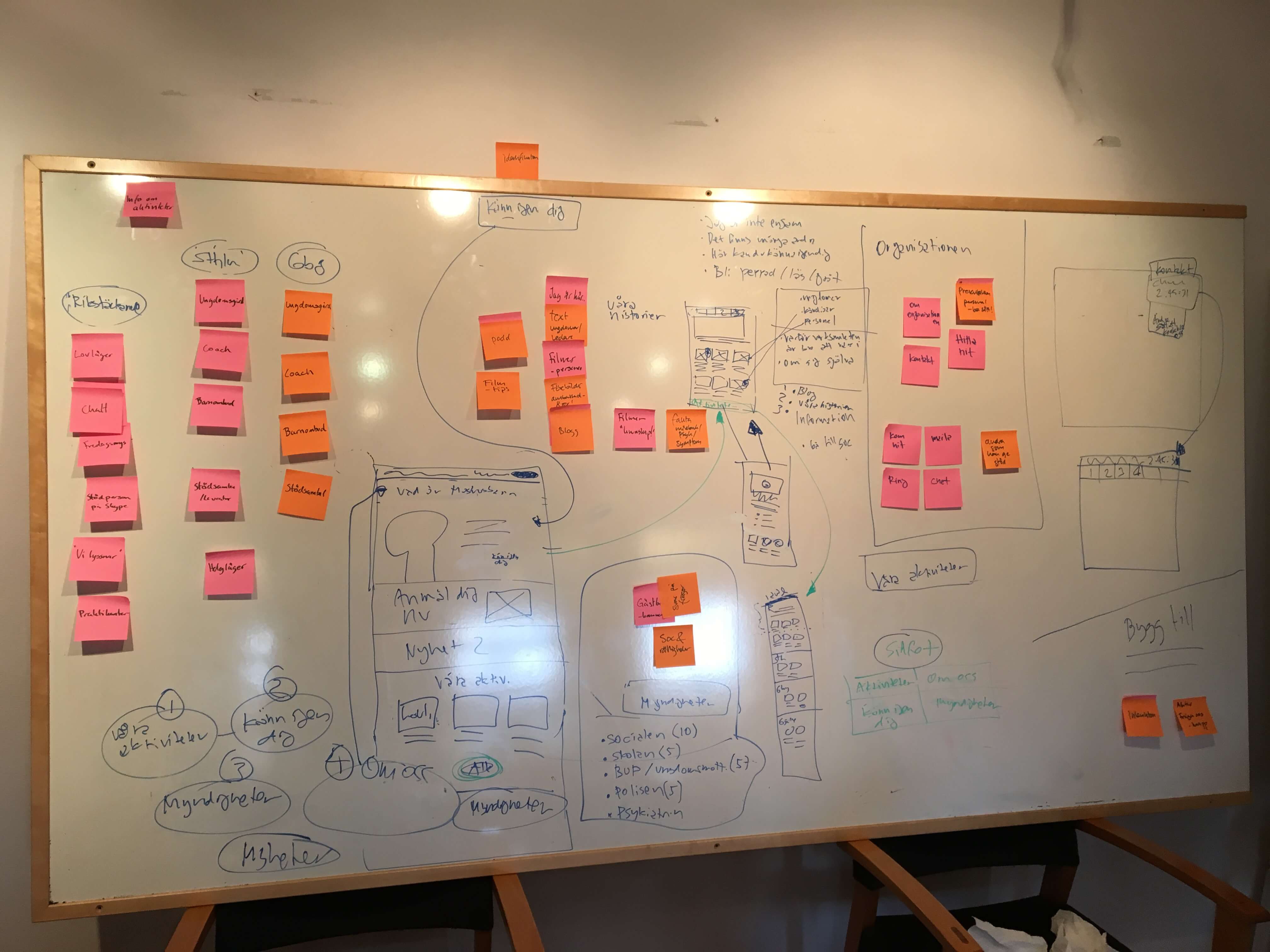 I ett tidig skede så handlade det om att bryta ner vilket innehåll som fanns på webbplatsen idag, och vilka sidor och funktioner som skulle läggas till. Alla dessa skrev vi upp på post-it lappar som vi satte upp på en stor whiteboard, och tillsammans sorterade vi dessa, för att hitta en tydlig och logisk struktur, sommme mötte användarnas behov.