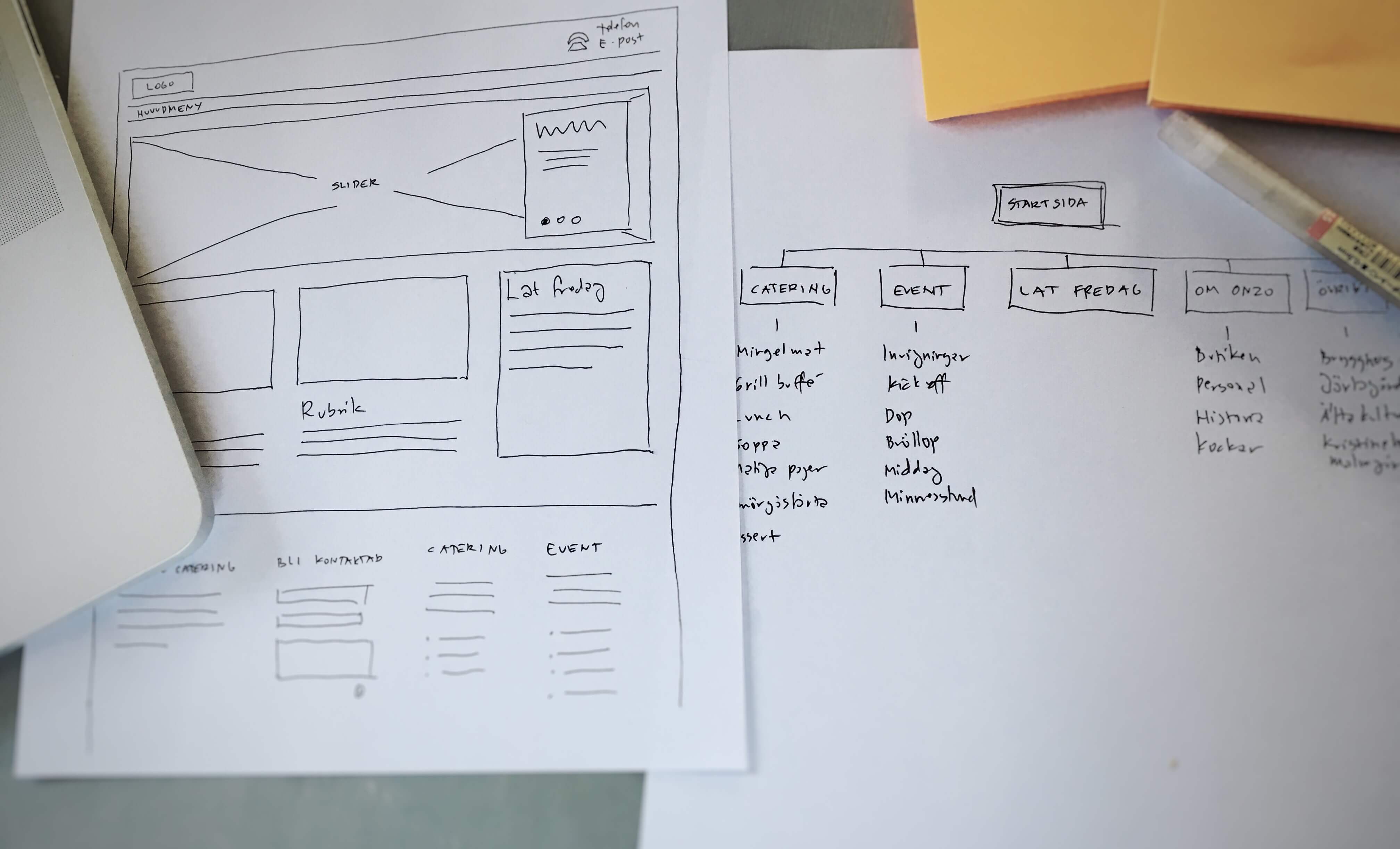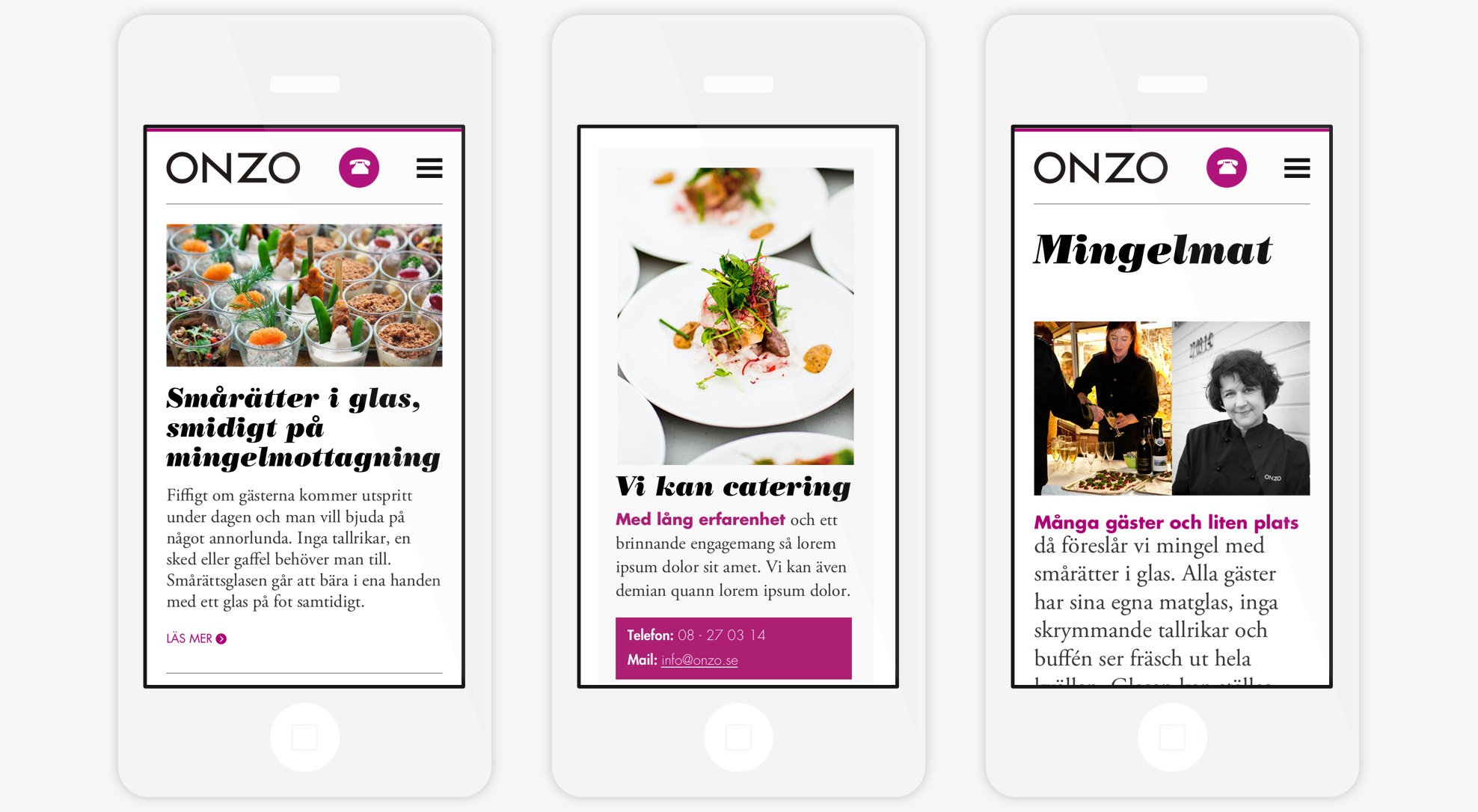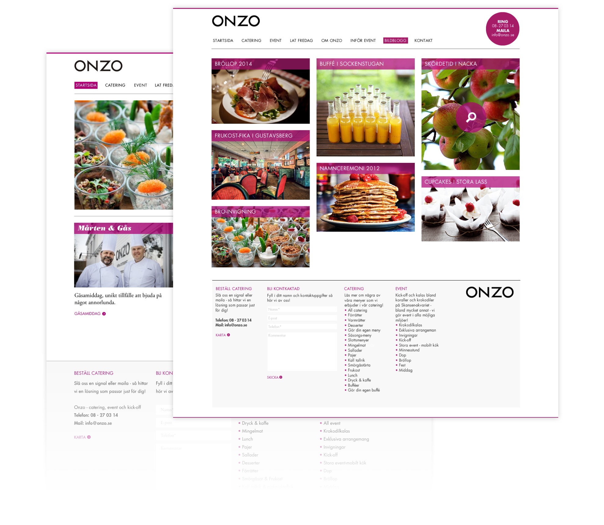 För Onzo catering handlade det mycket om att bygga en webbplats som på ett tydligt sätt lyfter fram deras breda utbud – och på flera olika sätt komma i kontakt med företaget. Här har vi börjat strukturera innehållet, och titta på användargränssnittet för första sidan.