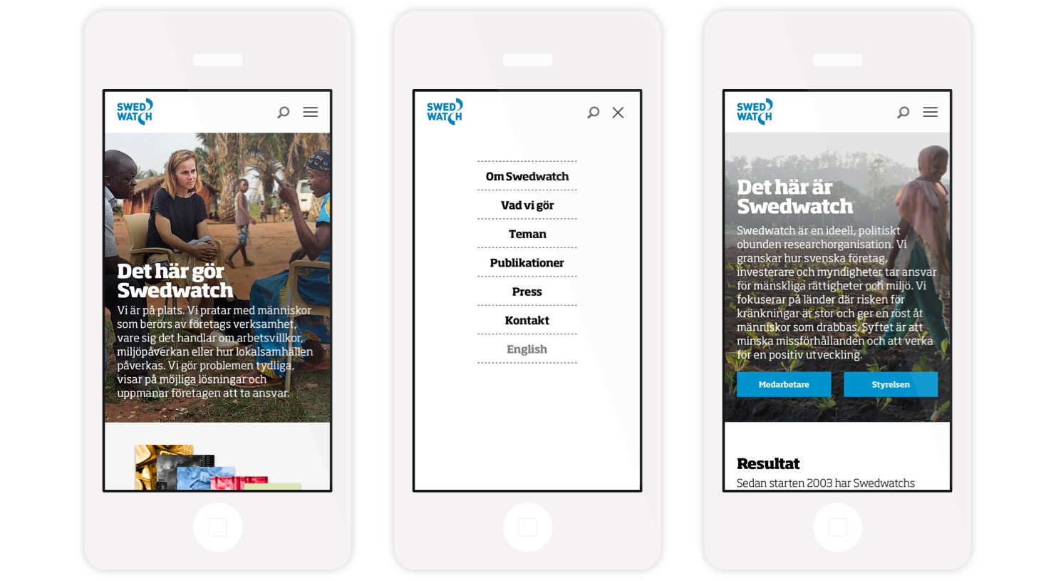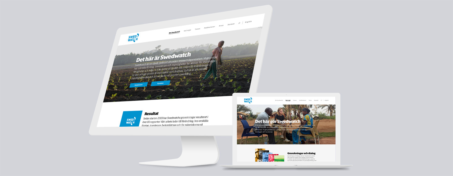 En viktig del av uppdraget var att förtydliga vilka områden Swedwatch jobbar med. Vi gjorde det genom att ta fram landningssidor för de olika fokusområden som Swedwatch är verksamma inom. Där kan användaren läsa om på vilket sätt Swedwatch jobbar inom olika områden.